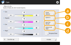Podeu desar fins a quatre opcions després de l'ajustament. Un cop ajustat el color, premeu <Recuperar/Desar>  seleccioneu un botó de <C1> a <C4>  premeu <Desar>  <Sí>  <Bé>. |