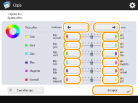 per a <Tots colors>. Per establir cada color per separat, utilitzeu els botons de l'esquerra i la dreta per a cada color. Un cop finalitzat l'ajust, premeu <Bé>.