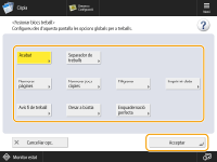 | | Podeu llegir múltiples originals amb opcions diferents i, a continuació, combinar els treballs en un de sol i imprimir-lo. Per exemple, podeu llegir un original amb l'opció Perforar i un altre amb l'opció de doble cara i, després, combinar-los en un sol treball i afegir-hi números de pàgina o portades a tot el conjunt per imprimir. |