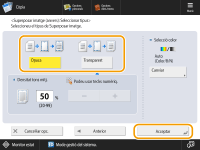 Per superposar la pàgina d'imatge sense ajustar-ne la densitat, premeu <Opaca>. Per superposar la pàgina d'imatge amb menys densitat, premeu <Transparent> i ajusteu-ne la densitat.