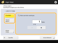 2 | Especifiqueu les pàgines que voleu eliminar. ![]() Per eliminar només una pàgina, premeu <Una pàgina> i introduïu el número de pàgina corresponent. Per eliminar diverses pàgines al mateix temps, premeu <Diverses pàgines> <Primera pàgina> o <Última pàgina> i introduïu els números de pàgina corresponents. |