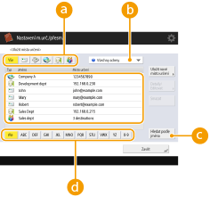 Pro administrátoraAdresář a tlačítka volby na jeden dotek lze exportovat/importovat. To lze využít pro zálohování dat nebo v případě poruchy nebo pro zjednodušení postupu pro ukládání míst určení na různých podporovaných strojích. Další informace viz Zálohování/obnova dat. Adresář lze přizpůsobit pro každého přihlášeného uživatele (Seznam položek, které je možno personalizovat). Pomocí možnosti Synchronizovat vlastní nastavení lze navíc povolit sdílení adresáře několika multifunkčními tiskárnami Canon (Synchronizace nastavení pro více multifunkčních tiskáren Canon). V zájmu zamezení neoprávněného provádění změn nebo odstranění položek v adresáři můžete nastavit heslo. Nastavení kódu PIN pro adresář Existují-li nějaká místa určení, která nechcete zobrazit v adresáři, nebo chcete omezit přístup uživatelů k místům určení, při ukládání místa určení zadejte přístupové číslo. Chcete-li použít přístupové číslo, musíte předem aktivovat nastavení v Omezení přístupu k místům určení uloženým v adresáři. Nakonfigurujte seznamy adres uživatelských skupin přes Remote UI (Vzdálené UR). (Uložení míst určení prostřednictvím Remote UI (Vzdálené uživatelské rozhraní)) |