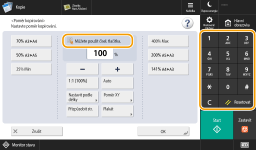 Když se zobrazí číselná tlačítkaKdyž se zobrazí zpráva < Můžete použít čísel. tlačítka.>, můžete zadávat číselné hodnoty pomocí číselných tlačítek.Příklad: Obrazovka nastavení <Poměr kopírování> ![]() Když se zobrazí zpráva < Zadejte pomocí číselných tlačítek.>, k zadávání čísel lze použít pouze číselná tlačítka.Zadejte znaky z USB klávesnice.Pro zadávání znaků můžete také použít USB klávesnici, kterou připojíte k USB portu (Přední strana). Při zadávání z USB klávesnice vezměte na vědomí následující. Nastavte <Použít ovl. MEAP pro vstupní zařízení USB> v <Nastavení USB> na <Vyp>. <Použít ovl. MEAP pro vstupní zařízení USB> Z USB klávesnice můžete zadávat pouze znaky ASCII. Tlačítka, která nejsou zobrazena na obrazovce klávesnice displeje dotekového panelu, např. Delete, End, Tab, Esc a tlačítka funkcí, nelze na USB klávesnici použít. Zvuk, který se ozývá při zadávání z USB klávesnice, odpovídá nastavení <Tón při vložení> a <Tón při nesprávném vložení> na obrazovce nastavení zvuku. Nastavení zvukových signálů |