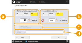 Nastavení pro hlášení správy komunikace nemůžete provést, když je <Zobrazit výpis úloh> v <Nastavení správy> nastaveno na <Vyp>. Dále, změníte-li <Zobrazit výpis úloh> v <Nastavení správy> z <Vyp> na <Zap>, <Tisk./odeslat každý zadaný počet přenosů.> a <Tisknout/Odeslat v zadaný čas> v hlášení správy komunikace se automaticky změní na <Vyp>. <Zobrazit výpis úloh> |