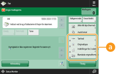 Registrering i <Favoritindst.>Du kan i <Favoritindst.> registrere ofte anvendte fremgangsmåder til kopiering samt ofte valgte modtagere og indstillinger til scanning. For flere informationer skal du se Registrering af en kombination af ofte anvendte funktioner. Ændring af standardindstillingen på skærmbilledet Grundlæggende funktionerNår du har ændret indstillingerne for hver funktion, kan du registrere de aktuelle indstillinger som en standard på skærmbilledet Grundlæggende funktioner ved at trykke på efterfulgt af <Skift standardindstillinger>. Hvis du logger på maskinen med personlig godkendelsesadministration (Logge på maskinen) inden udførelse af denne indstilling, bliver den registreret som din egen personlige standardindstilling (Liste over elementer, der kan tilpasses). |