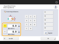 Tryk på <X> eller <Y> for at indtaste længden på hver side med taltasterne. ![]() Hvis du registrerer papirformatet, du anvender, på knapperne <S1> til <S5>, kan du hente dem med en enkelt tryk. Registrering af papir med frit format (Papir med brugerdefineret format) | |