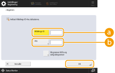 Sørg for, at afdelings-ID'er er blevet indstillet for de brugere, der registreres i maskinen. Registrering af brugerinformationer i den lokale enhed Administration af afdelings-ID er kun gyldigt for brugere, der er registreret på den lokale enhed. Hvis du logger på som en bruger med administratorrettigheder, tildeles der automatisk et Systemadministrator-ID og en Systemadministrator-PIN-kode, og administreres som afdelings-id. |