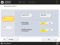 2 | Tryk på <Registrér>. ![]() Sådan redigeres indstillinger for afdelings-ID Vælg det afdelings-ID, du vil redigere, og tryk på <Redigér> for at vise skærmbilledet Redigér. Sådan slettes indstillinger for afdelings-ID Vælg det afdelings-ID, du vil slette, og tryk på <Slet> <Ja>. |