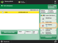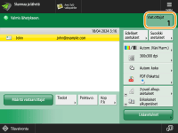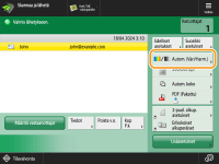 Määritettyjen vastaanottajien kokonaismäärän tarkistaminenMääritettyjen vastaanottajien määrä näkyy näytön oikeassa yläkulmassa. Näin voit varmistaa ennen lähettämistä, että vastaanottajien määrä on oikea. Lähetettävän työn peruuttaminen välittömästiJos painat käyttöpaneelissa  (Pysäytys), kun työtä lähetetään, esiin tulee ilmoitus <Peruutetaanko seuraava lähetystyö?>. Peruuta lähetys valitsemalla <Kyllä>. Kun painat  (Pysäytys) ja lähetystöitä on useita, esiin tulee näyttö peruutettavan työn valitsemista varten. Jos lähetystyötä, jonka haluat peruuttaa, ei näy näytössä, valitse <Tarkasta muut työt>, joka näyttää kohdan <Lähetä työt>. Valitse työ, jonka haluat peruuttaa ja paina <Peruuta>. Lähetettyjen/tallennettujen asiakirjojen tilojen tarkistaminen<Tilavalvonta>-näytössä voit tarkistaa lähetettyjen ja tallennettujen asiakirjojen tilan. Tässä ikkunassa voit lähettää/tallentaa asiakirjat uudelleen tai peruuttaa lähetyksen/tallennuksen tilan tarkistuksen jälkeen. Skannattujen asiakirjojen tilan ja lokin tarkistaminenKun <Näytä ilmoitus kun työ on hyväksytty> -asetuksena on <Kyllä>, <Tilavalvonta>-näyttö voidaan avata seuraavalla näytöllä, joka tulee esiin, kun lähetystyö vastaanotetaan. <Näytä ilmoitus kun työ on hyväksytty>Lähetyksen/tallentamisen tulosten raportin tulostaminenKun valitset skannauksen perustoimintonäytössä <Lisäasetukset>  <Lähetysraportti>, voit tulostaa automaattisesti raportin, jossa kerrotaan lähetyksen ja tallennuksen tulokset. Kun haluat asettaa tämän kullekin työlle kohdassa <Lisäasetukset>, sinun on valittava <Vain virhetilassa> tai <Ei> kohdassa <Lähetysraportti> ja määritettävä <Salli tulostus lisäasetuksista> -asetukseksi <Kyllä>. TiedostonimiKun tiedosto lähetetään/tallennetaan, sen tiedostonimi asetetaan automaattisesti seuraavan muodon mukaisesti. Voit muuttaa asetusta siten että erilainen nimi voidaan antaa. Tiedoston nimeäminenLähetys sähköpostitse "Työnumerot (neljä numeroa)_sivunumerot (kolme numeroa).tiedostopääte", kuten "1042_001.jpg" Tallennus tiedostopalvelimeen "Tiedoston tallennuksen vuosi, kuukausi, päivä, tunti, minuutti ja sekunti (14 numeroa).tiedostopääte", kuten "20151030133541.jpg" Sähköpostin aiheTunnista arkinsyöttölaite Tunnista arkinsyöttölaite Kun useita arkkeja on syötettySkannaus pysähtyy ja näyttöön tulee viesti. Poista tukos toimimalla ohjeiden mukaan. Kun olet poistanut tukoksen, työn jatkamisen näyttö tulee esiin. Jos laite havaitsee virheellisesti usean arkin syötön, jatka skannausta valitsemalla <Älä tunnista arkinsyöttölaitetta>. Jos haluat asettaa laitteen etukäteen olemaan ilmoittamatta usean arkin syötöstä, tee yksi seuraavista toimista. Aina, kun lähetät/tallennat asiakirjan, valitse <Lisäasetukset> skannauksen perustoimintojen näytössä  poista asetus käytöstä valitsemalla <Tunnista arkinsyöttölaite>. |
