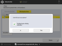 Schermen die leiden naar <Verzendopdrachten>/<Afdrukopdrachten> Het scherm <Home> Bovenste schermen van <Statusmonitor> (<Opdracht>, <Papier>, <Toner/Overige>) Het scherm <Visual Message Settings> Als u op het bedieningspaneel op (Stop) drukt terwijl een verzendopdracht wordt verwerkt en het scherm <Scannen en verzenden> wordt weergegeven, verschijnt een pop-upscherm dat de actieve opdracht direct annuleert. Wanneer meerdere opdrachten worden uitgevoerd, kunt u instellen welke opdracht u wilt annuleren: de laatst gemaakte opdracht of de opdracht die momenteel wordt verzonden. (<Opdrachten ter annulering wanneer op stop is gedrukt>)Als er een opdracht is gestart nadat u op het bedieningspaneel op (Stop) hebt gedrukt, wordt de opdracht uitgevoerd.Voor instructies over het annuleren van opdrachten vanaf het scherm <Kopie> raadpleegt u Kopiëren annuleren. |