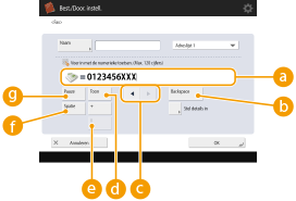 1 | Voer het faxnummer in. ![]() FaxnummerveldVoer met de numerieke toetsen het faxnummer in. Voer zo nodig tot in. <Backspace> Verwijder één voor één de cijfers links van de cursor in het faxnummerveld ( ) in.![]() /![]() Druk hierop bij het naar links of rechts verplaatsen van de cursor in het faxnummerveld ( ). <Toon>Als u op deze knop drukt, wordt het teken "T" (toon) ingevoegd. Zelfs als u pulskiezen gebruikt, worden cijfers na "T" verzonden met toonkiezen. <Spatie>Voer een spatie tussen de nummers in zodat ze gemakkelijker leesbaar zijn. <Pauze>Als u op deze knop drukt, wordt het teken "P" (pauze) ingevoegd. Bij het faxen naar het buitenland voegt u na de internationale toegangscode of het faxnummer een pauze in. Dit helpt om de verbinding te verbeteren. ![]() U kunt aan het begin van een nummer geen pauze plaatsen. |
