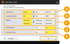 <Papierformaat>Stel het papierformaat in dat de ontvanger kan ontvangen. Geef deze instelling op nadat u hebt gecontroleerd of het papierformaat van de te verzenden gegevens overeenkomt met de specificaties van het apparaat van de ontvanger. <A4/LTR>: Verzendt met het A4/LTR-formaat. <A4/LTR> + <B4>: Verzendt met het A4/LTR-formaat of het B4-formaat. <A4/LTR> + <A3/11x17>: Verzendt met het A4/LTR-formaat of het A3/11" x 17"-formaat. <A4/LTR> + <B4> + <A3/11x17>: Verzendt met het A4/LTR-formaat, het B4-formaat of het A3/11" x 17"-formaat. ![]() Als het papierformaat van de gescande gegevens kleiner is dan de formaten die zijn ingesteld in <Papierformaat>, worden de gegevens verzonden met het kleinste papierformaat dat is ingesteld in <Papierformaat> met blancomarges. Als het papierformaat van de gescande gegevens groter is dan de formaten die zijn ingesteld in <Papierformaat>, worden de gegevens verzonden met het grootste papierformaat dat is ingesteld in <Papierformaat>. Stel de bestemmingscondities in volgens de specificaties van de machine van de andere partij. Als het papierformaat van de te verzenden gegevens groter is dan de papierformaten die kunnen worden gebruikt met het apparaat van de ontvanger, wordt de afbeelding mogelijk afgekapt of afgesneden. <Compressiemethode>Selecteer de compressiemethode. De compressiesnelheid is het hoogst voor MMR, gevolgd door MR en daarna MH. Hoe hoger de compressiesnelheid, des te korter de vereiste verzendduur. <Resolutie>Selecteer een hogere waarde om de resolutie en beeldkwaliteit te verhogen. Door een hogere resolutie echter neemt de vereiste verzendduur toe. <Verdeel gegevens>Als de grootte van de te verzenden gegevens de limiet overschrijdt (<Max. bestandsgr. bij verzending>), selecteert u of u de gegevens op basis van grootte of op basis van pagina wilt verdelen. Als u <Aan> selecteert, worden de gegevens in kleinere stukken opgedeeld die de limiet niet overschrijden, en worden ze in verschillende delen verzonden. Het apparaat bij de ontvanger moet de ontvangen gegevens wel kunnen combineren. Als u <Uit> selecteert bij <Verzenden via server> ( ) bij stap 1 voor de configuratie van de I-faxinstelling, worden de gegevens onverdeeld verzonden, zelfs al wordt de maximale limiet overschreden. <Ontvangen in kleur>Hiermee kunt u in kleur verzenden, als de doelmachine kleuren ondersteunt. Druk op <Aan> <Volgende> en stel het papierformaat en de resolutie in.![]() Stel de bestemmingscondities in volgens de specificaties van de machine van de andere partij. Als u condities instelt die de machine van de ontvanger niet ondersteunt, kan er een verzendfout optreden. |
