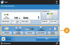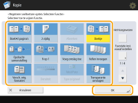 Het aantal instellingen op het scherm met basisfuncties en de plaats waar ze worden weergegeven, kan verschillen afhankelijk van hun functies. Er wordt geen sneltoets weergegeven als <Niet-toegewezen> is ingesteld als een sneltoets. De limiet voor het aantal sneltoetsen voor <Opties> dat u kunt registreren is als volgt. Kopie (normale kopie): 5 Kopie (spoedkopie): 6 Scannen en verzenden: 2 Als u het scherm met basisfuncties voor kopiëren hebt gewijzigd in het scherm Spoedkopie (De instellingen snel wijzigen (Scherm Spoedkopie)), selecteert u de knop bij stap 3 en drukt u vervolgens op <Registreren>. |