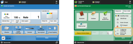 U kunt de instellingenknoppen wijzigen die worden weergegeven op de schermen met basisfuncties (voor kopiëren en scannen). U kunt ook een ander scherm met basisfuncties weergeven dat is aangepast voor elke aangemelde gebruiker.