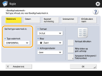 2 | Selecteer het type watermerk. ![]() Om willekeurige tekst in te sluiten, selecteert u <Gebr.> en voert u de tekst in door op <Invoeren> te drukken. ![]() U kunt veelgebruikte tekst registreren. Selecteer <Gebr.> en voer de tekst in door op <Registreren> te drukken. Als u geregistreerde tekst wilt bewerken of verwijderen, drukt u op <Registreren>, selecteert u de tekst in de lijst en drukt u op <Bewerken> of <Verwijderen>. |