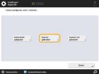 Reinig de scangebieden op de glasplaat en in de invoerlade voordat u aanpassingen maakt. De aanvoer reinigen Gebruik de volgende condities om de proefpagina af te drukken. Nauwkeurige aanpassingsresultaten worden wellicht niet behaald als de proefpagina niet correct is afgedrukt. Papierformaat: 100 mm x 148 mm tot 297 mm x 762 mm Afwerken: Niet-gecoat, Gerecycled, Katoen Type: Normaal, Briefpapier Basisgewicht: 52 tot 220 g/m2 Als u de proefpagina afdrukt op papier van een ander formaat dan het aangegeven papierformaat, wordt de beeldpositie mogelijk niet goed aangepast. Als een rand van de proefpagina onjuist is afgesneden of gevouwen, of als de afbeelding niet correct op de proefpagina is afgedrukt, kan de melding <Plaats de proefpagina goed op de glasplaat.> worden weergegeven tijdens het scanproces. Op enkele papiersoorten kunnen aanpassingen niet correct worden uitgevoerd, zoals papier met textuur met een grof oppervlak of gekleurd papier. Als een aanpassing niet correct werd uitgevoerd als <Scanner gebruiken> is geselecteerd, selecteert u in plaats daarvan <Scanner niet gebruiken>. In de volgende gevallen kan de proefpagina niet goed worden gescand en kan de aanpassing niet worden uitgevoerd: De proefpagina is scheef tijdens het scannen Het papierformaat is als EXEC of G-LGL, wat scheef kan zijn tijdens het scannen omdat de papiergeleider niet kan worden vastgezet. |