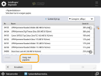 U kunt de lijst sorteren op datum van opslaan, naam of basisgewicht door een optie te selecteren in de keuzelijst. U kunt oplopend of aflopend sorteren. Gedetailleerde informatie over het geselecteerde papier kan worden getoond door op <Details> te drukken U kunt de pagina's wijzigen door op [  ]/[  ] te drukken om typen papier te selecteren en op te slaan die op andere pagina's worden weergegeven. |