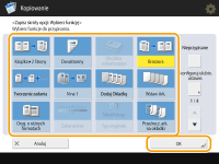 Liczba elementów ustawień zlokalizowanych na ekranie podstawowych funkcji oraz ich wyświetlana lokalizacja mogą się różnić w zależności od funkcji. Skrót przycisku nie jest wyświetlany, jeśli <Nieprzypisane> ustawiono jako skrót. Limit liczby skrótów, które można zarejestrować dla <Opcje>, jest następujący. Kopiowanie (podstawowe): 5 Kopiowanie (ekspresowe): 6 Skanowanie i wysyłanie: 2 Jeżeli zmieniono ekran podstawowych funkcji kopiowania na ekran ekspresowego kopiowania (Szybka zmiana ustawień (Ekran ekspresowego kopiowania)), wybierz przycisk wybrany w punkcie 3 i naciśnij <Zapisz>. |