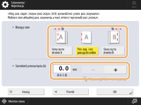 Wyreguluj pozycję składania i zszywania przy zszywaniu zeszytowym tak, aby znajdowały się na środku papieru. Wydrukuj stronę testową, sprawdź bieżący stan pozycji składania i szerokości przesunięcia na stronie testowej, a następnie wykonaj regulację.