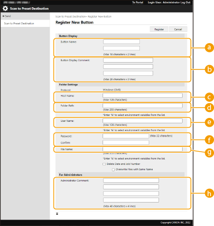 Możesz zarejestrować przycisk skanowania, w którym można określić folder docelowy zawierający nazwę użytkownika lub nazwę pliku z datą skanowania. Dzięki użyciu tego przycisku można uniknąć wysłania zeskanowanych danych do złego miejsca docelowego lub pomylenia zeskanowanych danych.