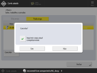 Ecrãs que conduzem a <Trbs envio>/<Trabs impr.> Ecrã <Início> Ecrãs superiores de <Contr. estado> (<Trabalho>, <Papel>, <Toner/Outro>) Ecrã <Visual Message Settings> Se carregar em (Parar) no painel de controlo durante o processamento de um trabalho de envio e enquanto é apresentado o ecrã <Ler e Enviar>, aparece um ecrã de contexto que cancela diretamente o trabalho em curso. Quando existem vários trabalhos em curso, pode especificar que trabalho pretende cancelar: o último trabalho efetuado ou o trabalho que está a ser enviado. (<Trab. a canc. qd carreg. em Parar>)Se existir um trabalho que tenha sido iniciado depois de carregar em (Parar) no painel de controlo, o trabalho é efetuado.Para obter instruções sobre como cancelar trabalhos a partir do ecrã <Cópia>, consulte Cancelar a cópia. |