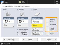 selecione <Corte na vertical> ou <Corte 3 vias> e depois introduza o formato de finalização desejado
