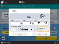 Não pode selecionar <Exemplo de impressão> para os seguintes trabalhos. Um trabalho para o qual está programado o modo Agrupar ou Offset Agrupar Um trabalho que está em pausa ou à espera de ser copiado Um trabalho cuja cópia está atualmente interrompida Um trabalho que está atualmente a ser copiado como exemplo Um trabalho que está atualmente a ser impresso como exemplo Se a cópia restante for a última ou quase a última, não pode fazer um exemplo de impressão selecionando <Todas as páginas>. Se as páginas de um trabalho cópia forem poucas, pode não conseguir fazer um exemplo de impressão selecionando <1 página (aleatória)>. A impressão pode demorar algum tempo, mesmo que selecione <Exemplo de impressão>. |