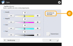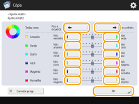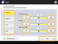 <Ajuste fino densidade>Selecione uma cor e ajuste o respetivo nível de densidade de acordo com a área de densidade utilizando o botão <-> ou o botão <+>. Quando o ajuste estiver concluído, carregue em <OK>.