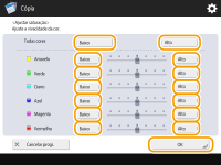 para <Todas cores>. Para programar cada cor separadamente, utilize os botões à esquerda e à direita de cada cor. Quando o ajuste estiver concluído, carregue em <OK>.