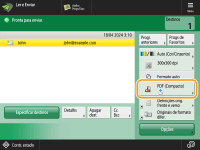 Para verificar o número total de destinos especificadosO número total de destinos especificados é apresentado na parte superior direita do ecrã. Isto permite-lhe confirmar se o número de destinos está correto antes do envio. Para cancelar imediatamente um trabalho que está a ser enviadoSe carregar em  (Parar) no painel de controlo enquanto um trabalho está a ser enviado, é apresentada a mensagem <Cancelar o trabalho de envio seguinte?>. Carregue em <Sim> para cancelar o envio. Carregue em  (Parar) quando existirem vários trabalhos de envio para apresentar o ecrã e selecionar o trabalho a cancelar. Se o trabalho de envio que pretende cancelar não for apresentado, carregue em <Verif. outros trabalhos> para apresentar <Trbs envio>. Selecione o trabalho que pretende cancelar e carregue em <Cancelar>. Para verificar os estados de documentos enviados/guardadosNo ecrã <Contr. estado>, pode verificar os estados dos documentos enviados/gravados. Este ecrã permite enviar/gravar documentos novamente ou cancelar a operação de enviar/gravar após a verificação dos estados. Verificar o estado e o registo de documentos lidosSe o item <Mostrar notificação quando trabalho for aceite> for programado para <Ligado>, é possível aceder ao ecrã <Contr. estado> a partir do ecrã seguinte que é mostrado após a receção de um trabalho de envio. <Mostrar notificação quando trabalho for aceite>Para imprimir o relatório dos resultados de enviar/gravarNo ecrã de funções básicas de leitura, carregar em <Opções>  <Relatório TR.> permite programar a impressão automática do relatório com os resultados de envio/guardar. Para programar isto para cada trabalho em <Opções>, tem de selecionar <Só para erros> ou <Desligado> em <Relatório TR.> e, em seguida, programar <Permitir a partir de Opções> como <Ligado>. Nome do ficheiroQuando um ficheiro é enviado/gravado, o nome do ficheiro é programado automaticamente com base no formato seguinte. É possível alterar a programação para que seja atribuído um nome diferente. Programar o nome de um ficheiroSe enviar por e-mail Formato "Número do trabalho (quatro dígitos)_número de páginas (três dígitos).nome da extensão do ficheiro", por exemplo "1042_001.jpg" Se gravar num servidor de ficheiros Formato "o ano, mês, dia, hora, minuto e segundo em que o ficheiro é gravado (14 dígitos).nome da extensão do ficheiro", por exemplo "20151030133541.jpg" Assunto da mensagem de e-mailDetet. ali. vár. folh. aliment. Detet. ali. vár. folh. aliment. Quando são alimentadas várias folhasA leitura é interrompida e a mensagem é apresentada no ecrã. Siga as instruções para retirar o papel encravado. Quando tiver retirado o papel encravado, o ecrã para retomar o trabalho é apresentado. Se a máquina detetar incorretamente a alimentação de várias folhas, carregue em <Não detetar alim. várias folhas> para retomar a leitura. Para programar a máquina antecipadamente para não o notificar da alimentação de várias folhas, efetue uma das operações seguintes. Sempre que enviar/guardar um documento, carregue em <Opções> no ecrã das funções básicas de leitura  selecione <Detet. ali. vár. folh. aliment.> para desativar a programação. |