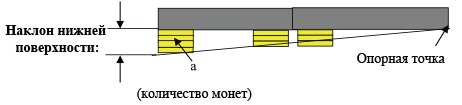 Наклон пола (Этот метод используется, если пол имеет небольшой уклон.) | Расположите две плиты настила рядом друг с другом и положите их на то место, где планируется установить аппарат. Также как и в способе «Ровность пола», одну плиту положите горизонтально. Затем вставьте прокладки (круглые опоры) под другую плиту пола, чтобы установить плиту горизонтально с той высотой, которую вы установили сначала. В этом случае вставьте прокладки в произвольном положении с краю плиты. Измерьте наклон пола с помощью толщины прокладок, расположенных дальше всего от опорной точки (точка, определенная как контрольная отметка высоты) (см. рисунок ниже).
