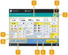 В этой области представлены сведения о состоянии параметра, такие как коэффициент масштабирования, формат бумаги, количество копий и т. д. Чтобы копирование было выполнено должным образом, обязательно проверяйте параметры в этом разделе экрана. Для изменения значений нажмите кнопку, расположенную под этой областью.