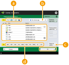 Раскрывающийся список для выбора типов адресной книгиПозволяет отобразить определенную группу адресатов. Если вы выполнили вход в систему аппарата с помощью управления аутентификацией для личных пространств, выберите <Personal Address List>, чтобы отобразить свою личную адресную книгу.