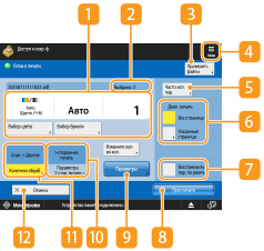 Служит для отображения состояний параметров, таких как формат бумаги для печати и количество экземпляров. Подтвердите параметры, чтобы печать была выполнена должным образом. Для изменения значений нажмите кнопку, расположенную под этой областью. Чтобы изменить количество экземпляров для печати, введите нужное число с помощью цифровых клавиш.