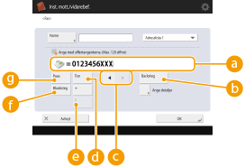 1 | Ange inställningar efter behov. ![]() <Skicka via server>Ange om du vill skicka I-fax till mottagare via e-post eller inte. Välj <På> om du vill skicka I-fax via e-post. Välj <Av> om du vill skicka data direkt till en mottagare på samma lokala nätverk (LAN). Genom att skicka direkt till en mottagare kan du skicka stora mängder data utan att belasta e-postservern. ![]() För att skicka I-fax som inte finns i ett IP-adressformat, som "användarnamn@[mottagarens IP-adress]", utan att använda en postserver, måste inställningar som t.ex. MX-poster (Mail eXchange) anpassas på DNS-servern. Fråga nätverksadministratören om denna typ av inställning är tillgänglig eller inte. Om du ställer in <Av> i <Skicka via server>, måste du också ställa in <På> i <Använd Skicka via server> i förväg. Om denna inställning är <Av>, kan inte inställningen i <Skicka via server> ändras. Vi rekommenderar att du ställer in <Tillåt MDN ej via server> till <På>. Även om du ställer in <Skicka via server> på <Av>, bekräftas leveransen av dokument som skickas med läget Full via servern. <Registrera standardfält>Den här inställningen krävs för att använda en Internet-faxtjänst. Om du inte använder en Internet-faxtjänst, behövs inte inställningen. För mer information, kontakta din Internet-leverantör. <I-faxadress>Ange I-faxadressen i följande format: adv01@example.com. När du skickar till en mottagare på samma nätverk använder du följande format: adv01@[192.168.11.100] (mottagarens enhetsnamn@[IP-adress]). Du behöver inte ange någon domän om domänen är fast. Du kan i förväg registrera ett domännamn i <Lägg autom. till ang. domän till mott. utan domän> och aktivera <Vid sändning av I-Fax> för att automatiskt lägga till en domän vid sändning, och då behöver du inte ange "@" och domännamn. Du kan registrera vanliga domännamn i <Registrerade tecken> på tangentbordet och du kan hämta dem när du anger en I-fax-adress. <Registrerade tecken för tangentbord> <Arbetssätt:>Du kan välja vilken typ av sändresultat som ska visas när du trycker på (Statusövervakare). Välj <Full> om du vill kontrollera om ett I-fax levererats till mottagarens maskin, eller välj <Enkel> om du vill kontrollera om ett I-fax levererats till en e-postserver. Observera att du inte kan kontrollera leveransstatus om mottagarens maskin inte har stöd för funktionen <Arbetssätt:>.![]() Om du skickar ett I-fax i läget <Full> till en maskin som inte har stöd för läget <Full> visas <Inväntar resultat...> när du trycker på (Statusövervakare) för att kontrollera leveransstatus, även om överföringen är klar. Det fortsätter att visas tills den tid som angetts i <Tidsgräns för fullständig S.> har förflutit.Du kan kontrollera leveransstatus genom att trycka på (Statusövervakare) <Skicka> <Jobblogg>. Om dokumentet skickats utan fel visas <OK>, om det inte kunde skickas visas <FEL> och om resultatet inte kan bekräftas visas <-->. I enkelt läge och även om leveransen utförs visas <--> eftersom leveransbekräftelsen inte kunde utföras. | |