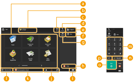 Med dessa knappar kan du öppna skärmar för grundläggande funktioner, t.ex. "Kopia" och "Scanna och skicka".