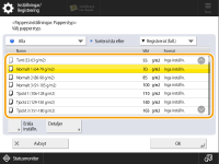 Medan du registrerar en egen papperstyp för en papperskälla är inställningarna för papperstyp skyddade och du kan inte ändra den detaljerade informationen för egen papperstyp eller radera den egna papperstypen i <Inställningar för hantering av papperstyp> i <Preferenser> (Inställningar/Registrering).