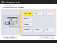 2 | Välj kuverttypen som är påfylld i papperslådan. Om du ställer in fel kuverttyp fastnar papperet. När du använder eget kuvertformat, trycker du på <Eget>  <Nästa>  och anger kuvertformaten. Tryck på <X> eller <Y>  och använd siffertangenterna för att ange längd på respektive format. |
