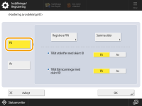 2 | Tryck på <Registrera>. ![]() För att redigera inställningar för avdelnings-ID Välj det avdelnings-ID du vill redigera och tryck på <Redigera> för att visa redigeringsskärmen. För att radera inställningar för avdelnings-ID Välj det avdelnings-ID du vill ta bort och tryck på <Radera> <Ja>. |