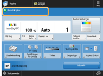 Visar inställningsstatus för exempelvis reproförhållande, pappersformat och antal kopior. Kom ihåg att bekräfta inställningarna för att kunna kopiera. För att ändra inställningarna, tryck på knappen under skärmbildsdelen.