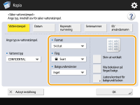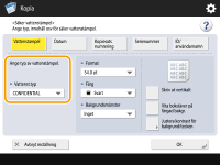![]() | När du kopierar dokument som innehåller konfidentiell information kan du bädda in osynlig text, t.ex. "HEMLIGT" eller "KONFIDENTIELL", för att varna obehöriga användare inte att kopiera dokumenten. När du kopierar ett dokument som redan har kopierats, visas den inbäddade texten över hela sidan, för att förhindra otillåten kopiering av kopior. Systemtillbehör Beroende på vilken maskin du använder kan den här funktionen vara tillgänglig som standard. |