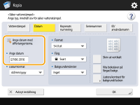 2 | Ange datum att bädda in. ![]() De registrerade datumen i maskinen visas i <Ange datum>. För att bädda in andra datum, använd siffertangenterna. |