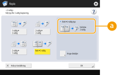 | | Du kan kopiera ett original med motstående sidor såsom böcker och magasin som separata sidor och dela upp de vänstra och högra sidorna. Du kan även göra 2-sidiga kopior genom att kopiera den högra sidan på framsidan och den vänstra sidan på baksidan. |