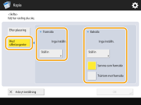 Om du vill flytta bilden på baksidan när du kopierar båda sidor, använder du inställningen <Baksida>. För att flytta till samma position på framsidan, tryck på <Samma som framsida>. För att flytta symmetriskt, tryck på <Tvärtom mot framsida>. För att flytta till en annan position än på framsidan, tryck på <Ställ in> och ange förflyttningsavståndet.
