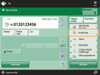 För att skicka fax utomlandsAnge det utländska åtkomstnumret, landskoden och faxnumret, i angiven ordning. Om det inte går att ansluta till mottagaren utomlands, tryck på <Paus> för att infoga en paus mellan ett nummer nästa nummer. För att skicka fax med en underadressEnheten har stöd för användning av underadresser enligt ITU-T* -standarden. Om mottagarens faxmaskin är kompatibel med ITU-T-standarden för subadresser, kan du förbättra sekretessen för skickade dokument genom att använda en subadress och ett lösenord. För att skicka ett dokument med en subadress, ange ett faxnummer, tryck på <Subadress> eller <Ange detaljer>, och ange sedan subadressen och lösenordet. * Förkortning för International Telecommunication Union-Telecommunication Standardization Sector, vilket är den grupp som utfärdar rekommendationer för standardisering av den internationella telekommunikationen. |