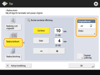 Om du vill justera bredden för de olika kanterna oberoende av varandra, tryck på <Radering runt originalet> eller <Radera bokkant>, och tryck sedan på <Separat justering> för att ange raderingsbredd. Om du använder <Radera bindning>, raderas även de kanter du inte väljer med 4 mm. |