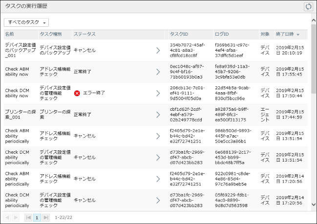 一括処理タスクの場合、[ステータス]には最後に実行されたサブタスクの実行結果が表示されます。したがって、一括処理タスクの[ステータス]が「正常終了」となっていても、最後のサブタスクより前に実行されたサブタスクが正常に終了していない可能性があります。