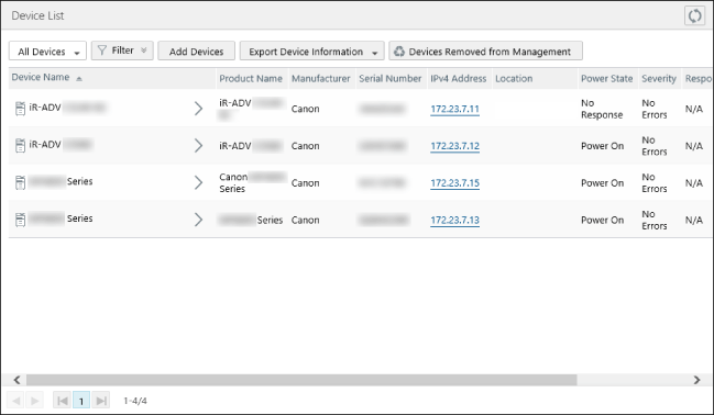 [Device Name] | Click the device name to display the [Device Details] page and check or edit the detailed information for the device. You can also remove devices from management. For details, see the following. |