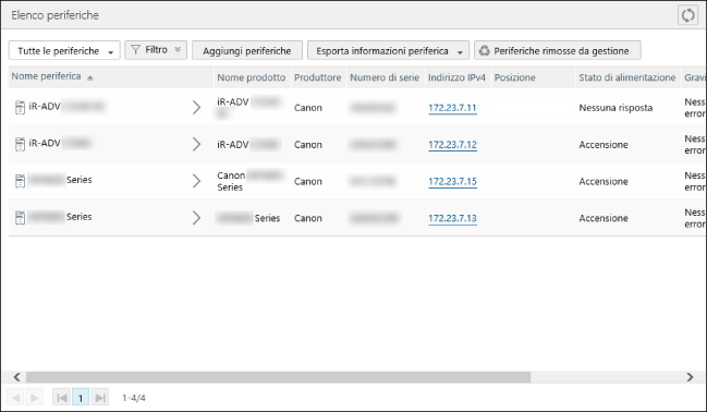 [Nome periferica] | Fare clic sul nome della periferica per visualizzare la pagina [Dettagli periferica] e verificare o modificare le informazioni dettagliate sulla periferica. È anche possibile eliminare le periferiche da gestire. Per ulteriori informazioni, vedere quanto segue. |