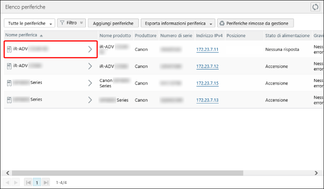 [Ai dettagli periferica] | Mostra la pagina [Dettagli periferica]. La pagina [Dettagli periferica] è uguale alla pagina visualizzata quando si fa clic sul nome periferica sulla pagina [Elenco periferiche]. |
